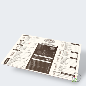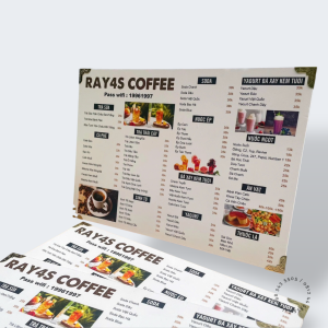 Menu được in trên giấy Couche 150–200gsm hoặc PP sữa, sau đó bồi lên Formex và cán màng mờ hoặc bóng.