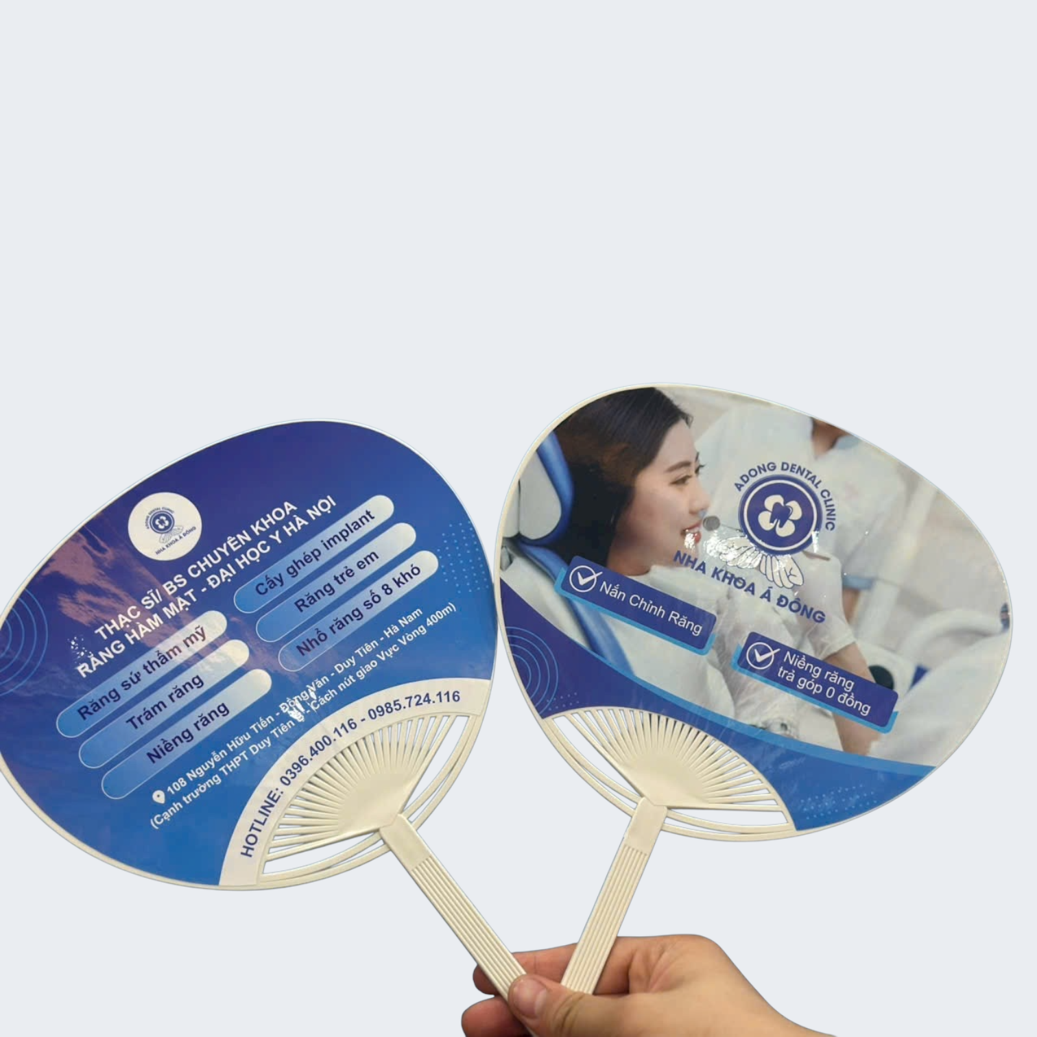 Khi khách hàng cầm trên tay chiếc quạt có logo, màu sắc, hotline rõ ràng, họ dễ nhớ đến phòng khám khi cần chăm sóc răng miệng.