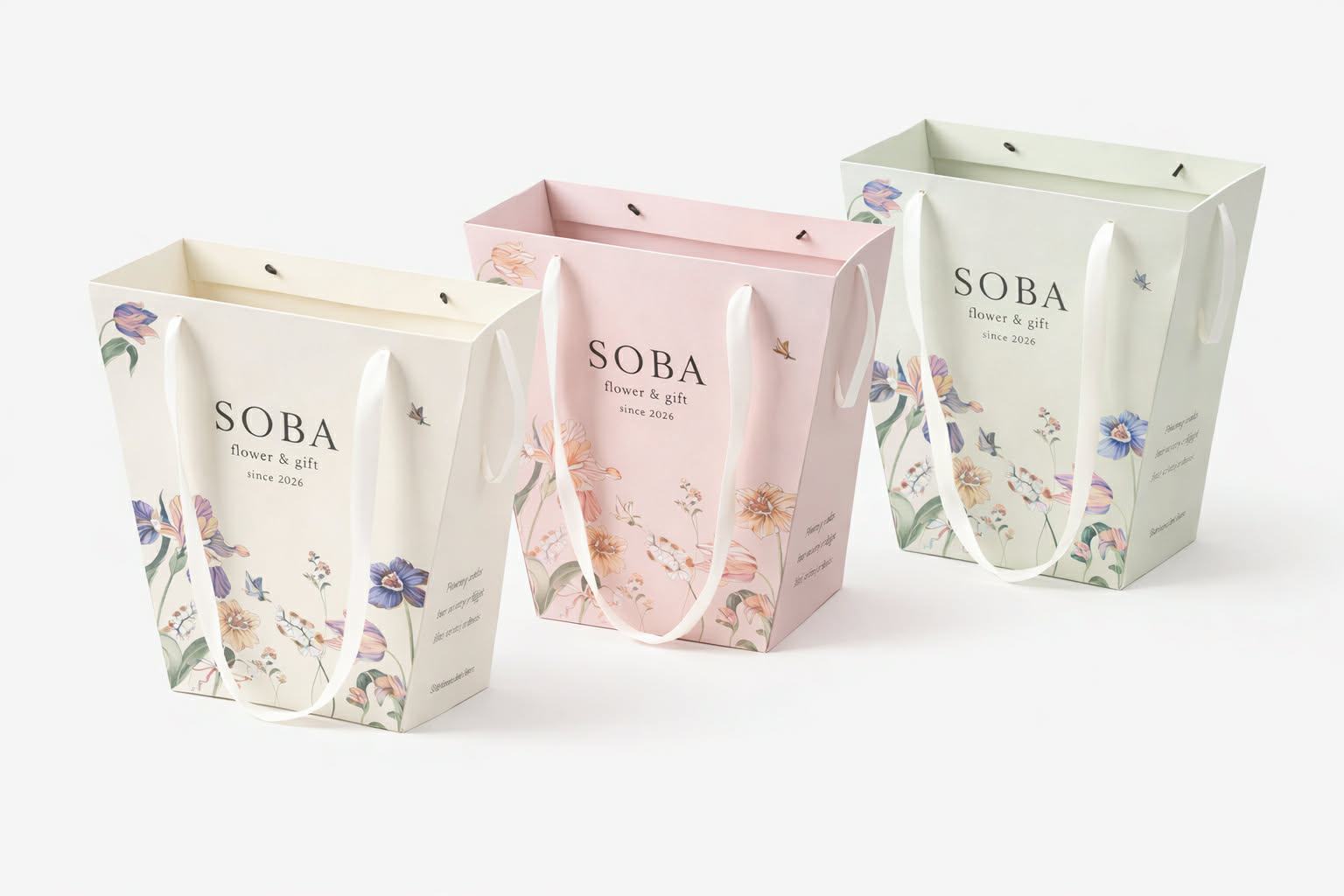 Hiện nay, đa số shop chọn túi đứng đáy vuông để dễ xếp hoa và không bị nghiêng. Thiết kế thường tối giản, chỉ có logo, tên shop và số điện thoại. Một số shop hoa cao cấp sẽ thêm ép kim logo hoặc dùng quai dây cotton để tăng cảm giác sang trọng khi khách cầm trên tay.